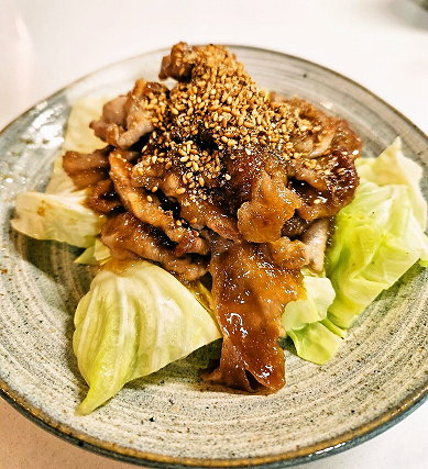 - 豚ロース肉はひと口大の大きさに切り、油をひかずに両面焼き②を絡め、水溶き片栗粉で軽くアンにし、①の上にのせる。仕上げに金つきたてごまをかける。